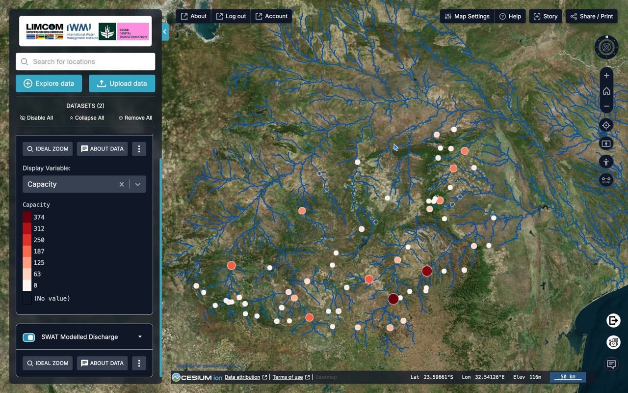 Using advanced hydrological modeling techniques, the Digital Twin simulates how water flows through the basin under different scenarios, including rainfall patterns, land use changes, and human activities such as irrigation and dam operations. This allows stakeholders to understand how different factors affect the overall hydrological system.