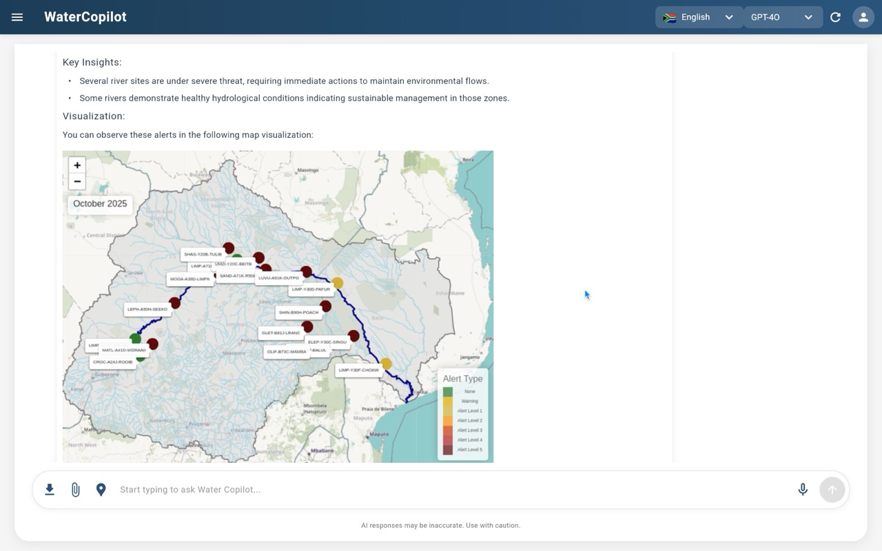 The Digital Twin continuously monitors near real-time data from the river basin and compares it with the simulated model. This enables stakeholders to detect anomalies, predict potential risks such as floods or droughts, and take proactive measures to mitigate them.