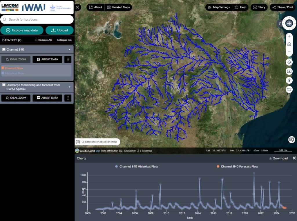 The SWAT model within the Limpopo River Basin Twin is integrated with real-time monitoring systems. Data from satellite imagery, gauge stations, and Earth observation tools feed into the model, enabling continuous updates to water body statuses and reservoir levels. The Waterbodies Importer Tool and the Discharges Importer Tool play a vital role in ensuring that the SWAT model has the most up-to-date information for generating accurate forecasts.
