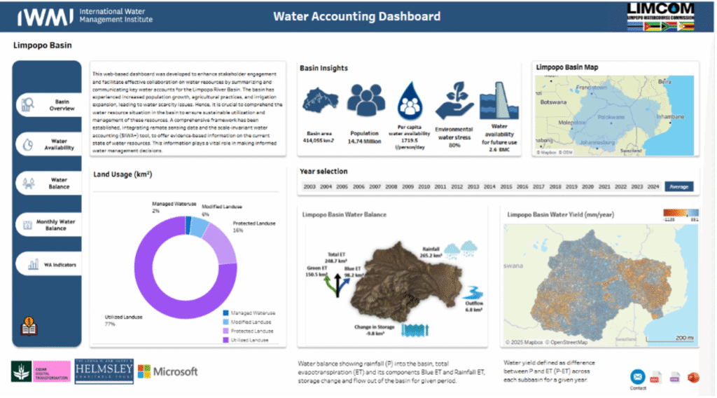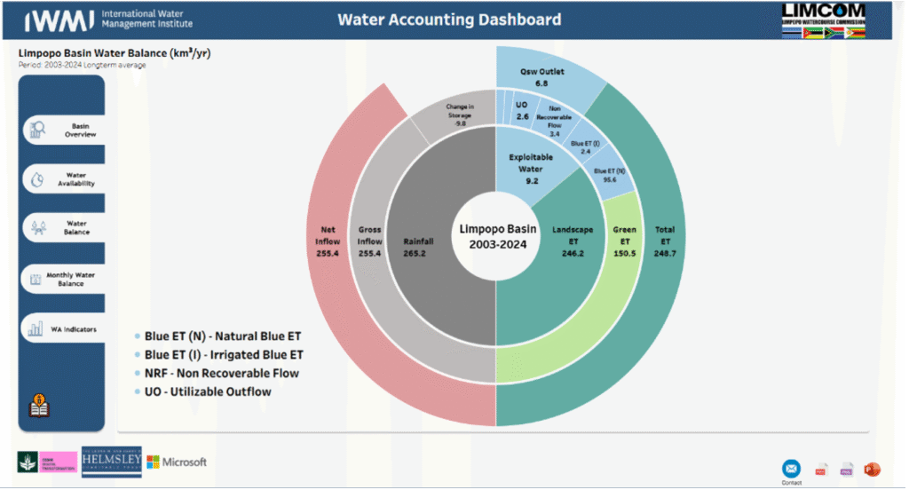 The Limpopo Water Accounting Dashboard provides an interactive platform to explore, analyze, and visualize key water resources information across the Limpopo River Basin.